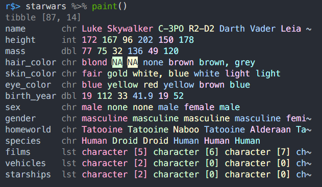 starwars %>% paint()いちいちpaint()関数を使用するのが面倒な場合はmask_print()関数を使用すれば、以後のプレビューはすべてpaint()関数でマスクされることになります。