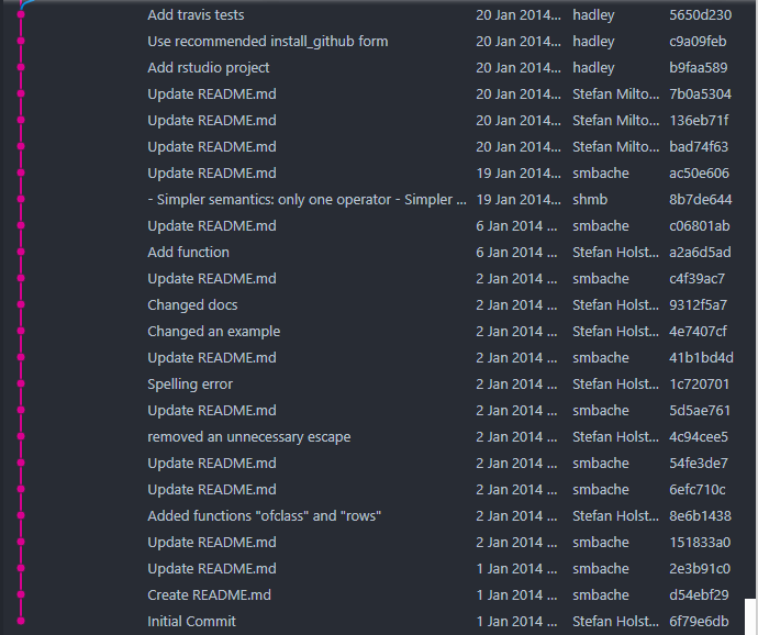 その後、2012年に始まったHadley Wickham氏の{plyr}パッケージプロジェクト({dplyr}の原型)にて、パイプ操作を可能にするchain()関数が導入され、2013年にはパイプ演算子%.%が導入されました。